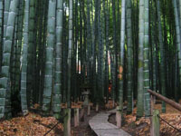Hokokuji is known as "Bamboo Temple". About 2,000 straight and tall bamboos rise heavenward, and sunlight gets into them. In the bamboo garden, only the sound of streams and rustling leaves break the silence. This makes you feel like being in another world far from busy urban life.